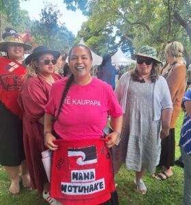 Te Poari, kaiwhakahaere at Waitangi grounds for pōhiri to greet Māori queen