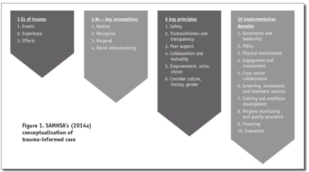 There are two important requirements for the provision of trauma-informed care: firstly, the delivery of care must be sensitive to a person’s experiences of trauma; secondly, iatrogenic trauma should not occur while the person is receiving care (Isobel, 2021; Pfeiffer & Grabbe, 2022). Iatrogenic trauma refers to the trauma or re-traumatisation which can be experienced by a person in the process of seeking care, where their behaviours are viewed as symptoms of illness (What is wrong with you?), rather than as coping adaptations to trauma experiences (What has happened to you?) (Sweeney et al., 2018). Non-trauma-informed responses to such behaviours may result in power imbalances, intrusive procedures, insensitive or humiliating interactions (Pfeiffer & Grabbe, 2022), coercive practices such as forced medication or restraint (Gooding et al., 2020), and culturally unsafe care (Pihama et al., 2017).