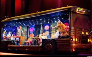 The curtain rose with three drag queens suspended from the proscenium, belting It’s Raining Men while male dancers in speedos worked the stage below. Priscilla herself was the star—literally centre stage—rotating and moving as the story demanded.