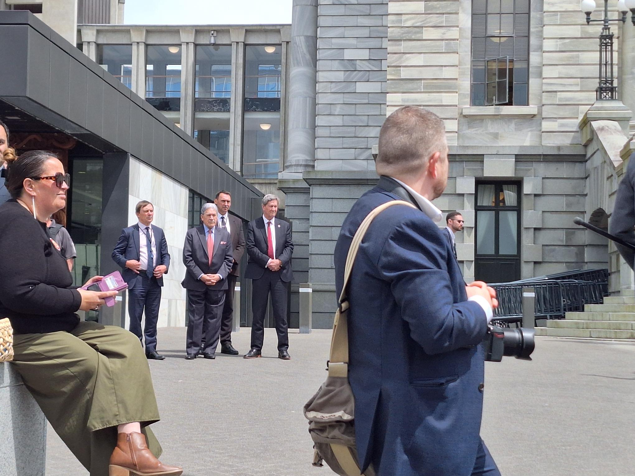 NZ First’s Winston Peters stood apart from the others, near the Beehive entrance. ACT’s Todd Stephenson spoke but was loudly heckled by audience members.