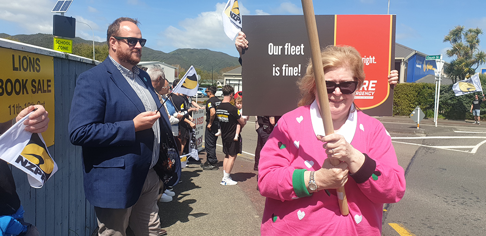 In Wellington, nurses Hilary Gardner and Gitta Majumder joined about 30 members of the New Zealand Professional Firefighters Union (NZPFU) striking outside Loafers’ Lodge, where five people lost their lives in a fire in 2023. They included dispatchers, volunteers and community trainers.