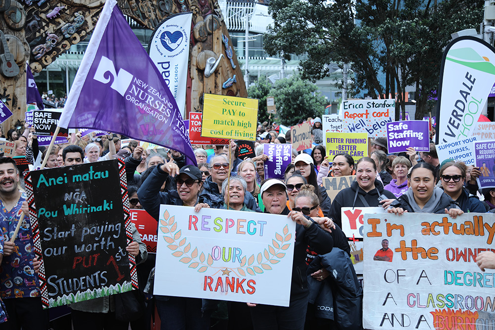 This includes nurses, midwives, health care assistants, doctors, teachers, principals and allied health workers from several unions including NZNO, NZEI, ASMS, PSA and PPTA.