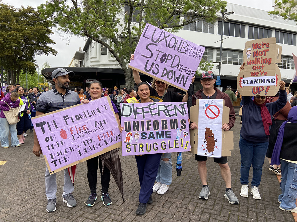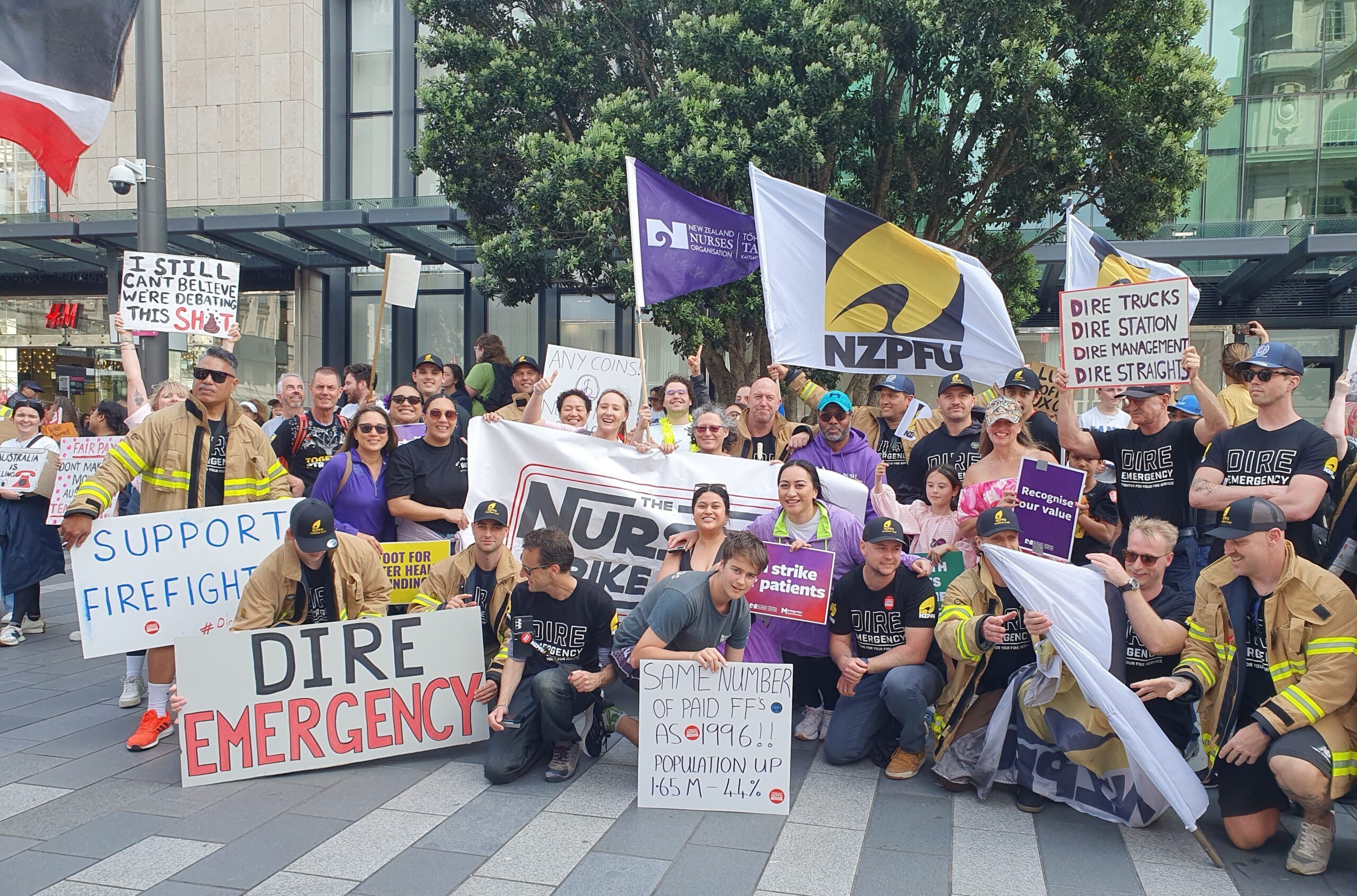 Last Friday it was firefighters’ turn to strike — about 2000 going out for an hour, with NZNO members supporting them. Many turned out today to support other frontline workers, often with their trucks which must stay at the stations during their own strikes.