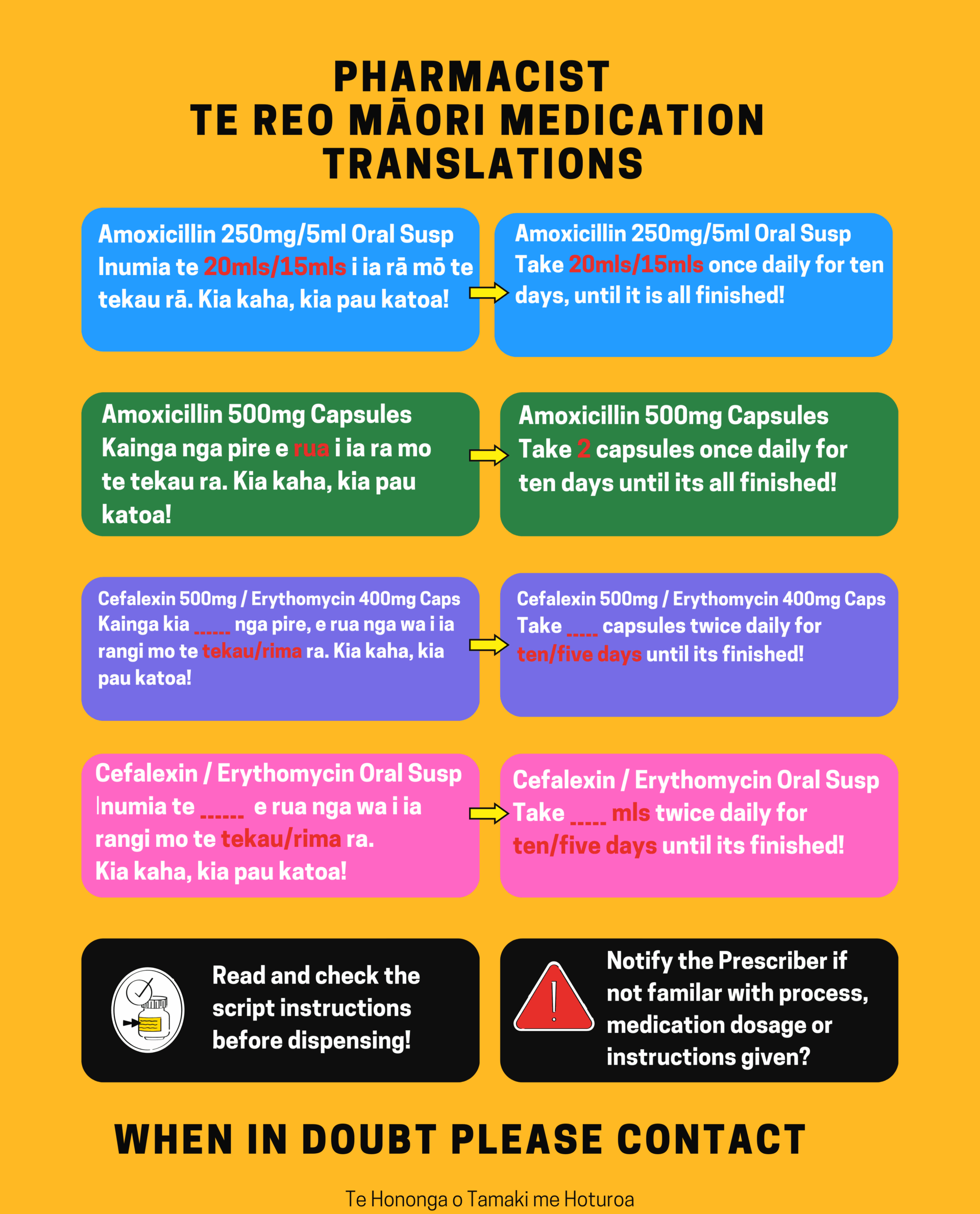 Now she delivers prescriptions to her regular pharmacies in te reo — and in bilingual format — that work with instructional posters she created for them.